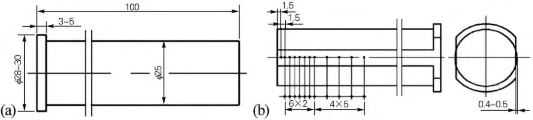 圖1 末端淬火試樣示意圖(a)及硬度檢測方案(b)