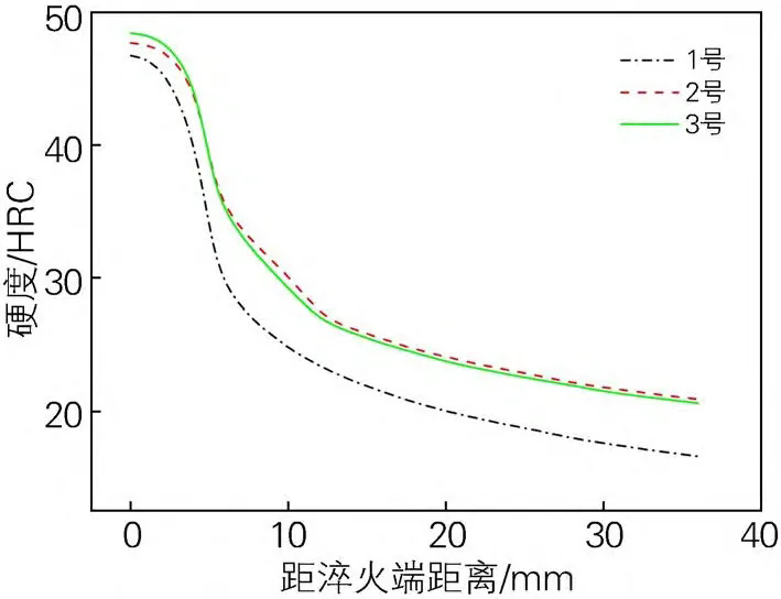 3種試驗(yàn)鋼中,3號鋼的淬火端硬度最高,2號鋼的淬透性曲線斜率變化最小,而1號鋼的淬透性最低,其距淬火端3mm以上位置的硬度均明顯低于其他2種試驗(yàn)鋼。