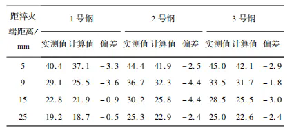 1號鋼距淬火端5、9mm位置的淬透性計算結(jié)果與實(shí)測結(jié)果偏差較大,分別為3.3HRC和3.6HRC,而15、25mm位置的計算結(jié)果偏差相對較小,均在1HRC以內(nèi);2號鋼典型位置淬透性的計算值與實(shí)測值偏差均較大,都超過了2HRC,且距淬火端9、15mm位置的偏差都達(dá)到了4.4HRC;3號鋼典型位置淬透性偏差在1.8~3.0HRC之間,最大淬透性偏差在距淬火端15mm處。