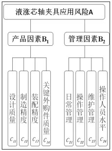 第三級(jí)因素選取8個(gè)風(fēng)險(xiǎn)因素組成指標(biāo)層C,第二級(jí)因素準(zhǔn)則層B包含產(chǎn)品因素和管理2個(gè)因素,第一級(jí)因素為目標(biāo)層液漲芯軸夾具應(yīng)用風(fēng)險(xiǎn)A。