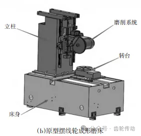 因此參照Y7654A型擺線輪磨齒機設計出原型擺線輪成形磨床的三維模型,如圖1(b)所示。