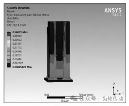 按照圖4所示邊界條件進行靜態分析,可以獲得機床原型立柱的最大應力以及變形位移,最大應力為0.56073MPa,變形位移為0.0057636mm,如圖6、圖7所示。