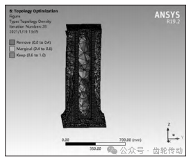 經過第一級的拓撲優化后,得到的立柱結構布局可以充分的 達到約束函數所約束的條件,同時載荷在立柱上的傳遞路徑清晰地顯示出來,拓撲優化結果具備:
