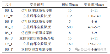 各參數初始值通過經驗法計算得出,為了得到最全面的優化解,DS_P、DS_Y、DS_U 等8個參數取值范圍由ANSYS Workbench中通過響應面模型建立而給定的最大范圍,如表2所示。