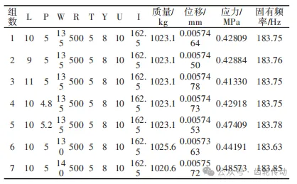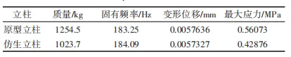 綜上所述,通過對圖13所得最優尺寸進行分析,選取相同約 束下目標函數最小的第三組尺寸與原型立柱進行相同邊界條件 下的靜動態性能對比,對比結果,如表4所示。