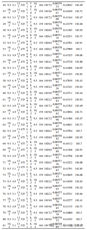 這里基于中心復合試驗設計方法抽取81組數據理論點,設置輸入參數為上述8個立柱內部尺寸,輸出參數為立柱一階固有 頻率、立柱質量、立柱最大應力及變形位移,提取數據理論點響應值,響應值,如表3所示。