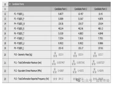 這里通過ANSYS Workbench Design Experiment中的Direct optimization模塊進行遺傳算法求解,通過遺傳算法篩選出符合約束函數下,目標函數最小的三組最優結構尺寸,如圖13所示。