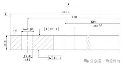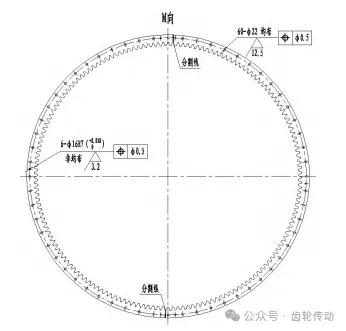 (3)內齒圈在端面 有安裝孔和定位孔,安裝孔規格60-Φ22均布,定位孔6-Φ16H7非均布。