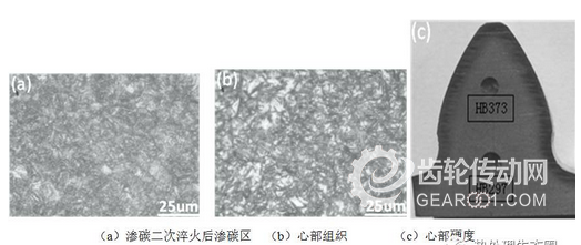 完成低溫回火工序后,剖檢滲碳直接淬火齒輪,滲碳區組織:回火馬氏體+殘留奧氏體1級+碳化物2級,晶粒度9級。心部:回火索氏體+少量鐵素體,晶粒度9級,心部硬度297~373HBW。將SNCM420H-K滲碳直接淬火齒輪與SNCM420H-K二次淬火齒輪的金相組織對比可看出,兩者基本相當,心部硬度稍有提高,由此可判斷,滲碳直接淬火對SNCM420H-K鋼滲碳組織影響不大,可使用滲碳直接淬火工藝取代滲碳二次淬火。