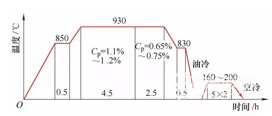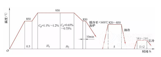 圖2 1818CrNiMo7-6 6模數(shù)齒塊滲碳加熱淬火工藝曲線