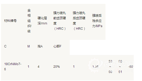 我國(guó)強(qiáng)力噴丸工藝在機(jī)械行業(yè)也是從20世紀(jì)80年代起,特別是近二十年隨著汽車制造業(yè)的崛起、風(fēng)電發(fā)電工業(yè)的發(fā)展才得以重視,并帶動(dòng)噴丸強(qiáng)化用介質(zhì)、設(shè)備和工藝技術(shù)的發(fā)展。介紹各種強(qiáng)力噴丸的資料不少,但對(duì)18CrNiMo7-6鋼不同硬化層深度下,強(qiáng)力噴丸對(duì)齒輪性能的影響研究不多。本文就強(qiáng)力噴丸對(duì)18CrNiMo7-6鋼不同硬化層深度齒輪的性能影響進(jìn)行研究,為18CrNiMo7-6鋼齒輪強(qiáng)力噴丸提供工藝試驗(yàn)依據(jù)。