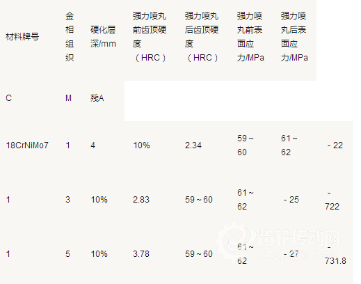 (2)18CrNiMo7-6鋼模數(shù)為15.25齒塊,滲碳緩冷,加熱淬火低溫回火后,硬度層深度分別為2.34mm、2.83mm、3.78mm,齒頂硬度為59~60HRC;強(qiáng)力噴丸后齒頂硬度為61~62HRC,齒頂硬度提高2~3HRC。