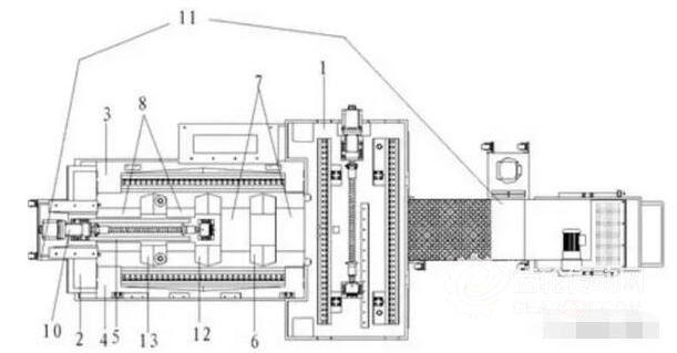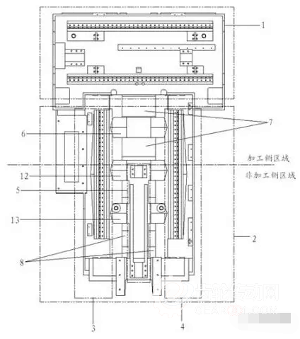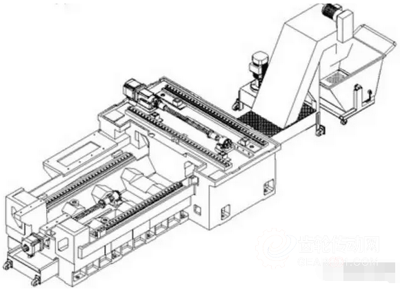 其包括 :X 軸底座、Z 軸底座、Z 軸導軌左 支撐體、Z 軸導軌右支撐體、橋式橫撐、加工側(cè)落屑通道、非加工側(cè)落屑通道、全貫穿底座空 腔、Z 軸驅(qū)動、Z 軸驅(qū)動安裝體和鏈板排屑器,