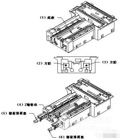 第一種(如圖 1)底座結(jié)構(gòu) :在底座(1)的 Z 軸驅(qū)動(4)兩側(cè),開 2 個貫穿整個底座的方 腔(2)(3),將螺旋排屑器(5)(6)置于方腔中,這一結(jié)構(gòu),落屑和排屑空間小,切削熱在狹 窄的排屑通道內(nèi),通過各金屬件向底座傳導,且不利于超大流量冷卻的切削液回流。