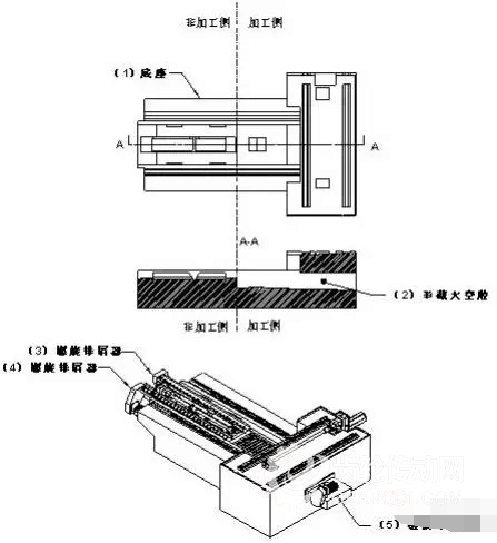 第二種(如圖 2)底座結(jié)構(gòu) :在底座(1)后部的加工側(cè),設(shè)置一個半截大空腔(2),將 加寬的鏈板排屑器(5)置于空腔(2)內(nèi)。在底座(1)前部的非加工側(cè),采用 2 個螺旋排屑器 (3)(4),將非加工側(cè)飛濺的零星切屑導入鏈板排屑器(5),這一結(jié)構(gòu),相比第一種結(jié)構(gòu),提升 了機床排屑能力,實現(xiàn)了加工側(cè)切屑和切削液的迅速排除底座,但是,其多個排屑器組合和 底座(1)內(nèi)部的前后階梯設(shè)計,增加了結(jié)構(gòu)的復雜程度和機床防護設(shè)計、制造和后期維護的 難度,非加工側(cè),飛濺的切屑仍然會將切削熱通過排屑器等金屬零件向底座傳導。