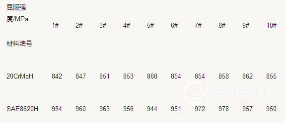 變速器齒輪可采用SAE8620H材料代替20CrMoH來提高齒輪根部的彎曲疲勞強度,表1為SAE8620H與20CrMoH材料主要化學成分的區別。SAE8620H材料Ni元素含量增加了約0.50%,Cr元素含量減少約0.50%,即用0.50%的Ni元素代替0.50%的Cr元素。Ni元素能中等強化鐵素體,增加Ni元素能很好地提高心部鐵素體組織的強度。分別抽取不同爐號的10個試樣,進行力學性能試驗,見表2,SAE8620H試樣屈服強度明顯高于20CrMoH試樣10%以上,有利于齒輪根部彎曲疲勞強度的提升。