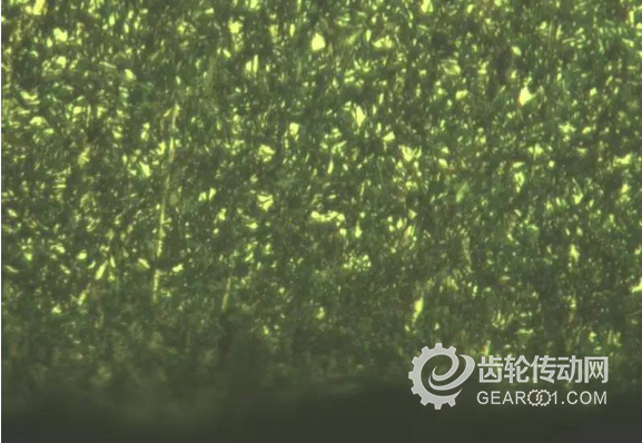 高能等離子噴涂工藝致使表層約20μm深度區域化學成分及顯微組織發生改變,從20μm~0.15mm處依然是噴丸強化層。高能等離子噴涂,采用Mo等合金元素組成的復合材料,鉬能使鋼的晶粒細化,提高力學性能。在高溫高壓的條件下撞擊并滲透進母材的20μm以內深度表面,使金屬表面20μm以內深度的晶相組織發生改變(見圖1、圖2),圖2表面波紋度很小,幾乎沒有晶界氧化,疲勞微裂紋就不易從表面發生,有利于齒面疲勞強度的提高。