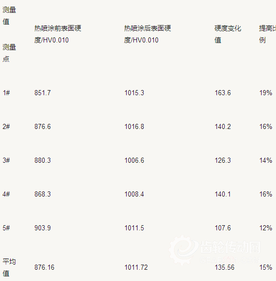 經過高能等離子噴涂后,表面顯微硬度有所提升(見表3),雖影響很淺,但能適當提升齒面接觸疲勞強度。