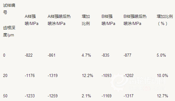 對扭矩要求更高的齒輪副,在齒部精加工后增加強力噴丸工藝,在齒輪表層形成一塑性變形層即強化層,當前我司噴丸強化工藝強化層深度約為0.15mm。利用該表面塑性變形層分別從殘余壓應力場、變形顯微組織、殘留奧氏體向馬氏體轉變、機加工刀痕的有效消除等方面來改善齒輪的疲勞強度。