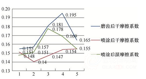 在加工過程中加入固體潤滑劑,固體潤滑劑滲入金屬表面后,使表面具有自潤滑的效果,摩擦阻力減少。經過摩擦試驗測試(見圖3),干摩擦因數下降12.1%,濕摩擦因數下降7.8%,齒輪副在嚙合過程中,齒面運轉狀況得到進一步改善。