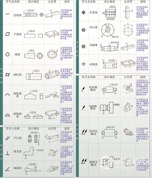 顧名思義,形位公差實際上包含了兩類不同的元素特征評價內容,一類是形狀公差、另一類是位置公差。形狀公差共包含直線度、平面度、圓度、圓柱度、線輪廓度和面輪廓度;而位置公差共包含平行度、垂直度、傾斜度、位置度、同心度、同軸度和對稱度。另外,還有一類特殊的形位公差稱作跳動,包括徑向/端面圓跳動和徑向/端面全跳動。跳動從實質上來說,也是評價被測元素的形狀誤差,因此我們不妨將其也歸入形狀誤差一類。