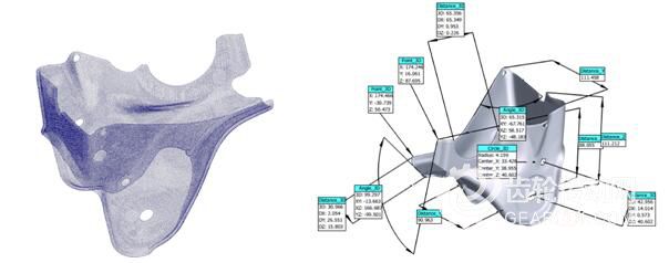 在得到了數字化表面模型后,用戶可以把數據用于各種目的,比如和CAD模型做對比,獲取零件整體/局部輪廓的偏差,三維尺寸測量或者逆向工程等等。但是這種測量方式用于尺寸與行為公差測量時,通常無法符合測量工藝流程的要求(如建立測量基準、選擇元素擬合方法、選取評價參考等等)。但是,有的零件或出于零件特殊性,如軟性材質、不允許接觸的表面、微小特征等,或出于測量效率的要求,確實需要非接觸式測量。對于此類應用,點光源測頭也很好彌補了接觸式測頭的不足。