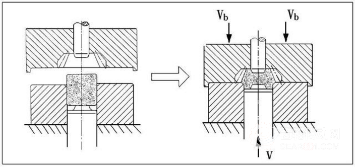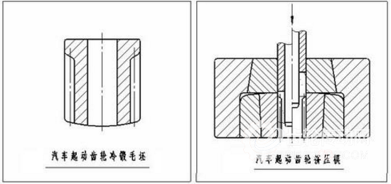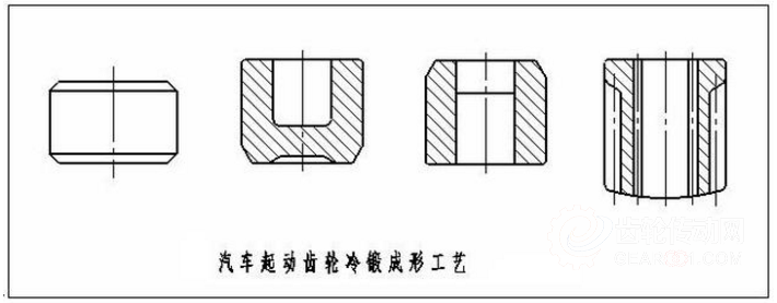 園柱齒輪的正擠壓成形是較早得到應用的齒輪成形工藝。典型零件是汽車起動電機小齒輪,及齒輪正擠壓模具結構。圖11.是起動齒輪的工藝過程。