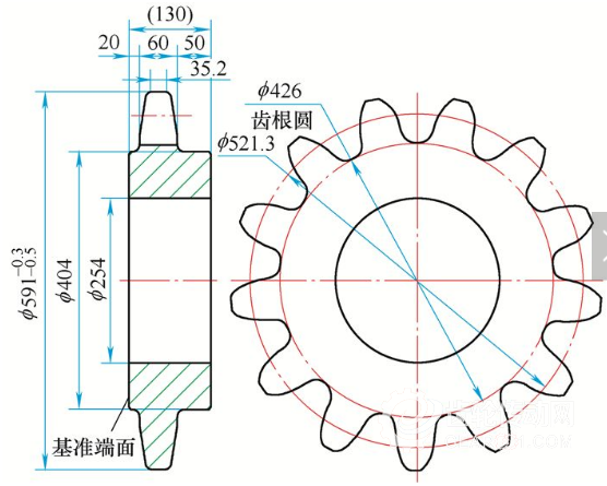 某圖號行走齒輪(見圖1),材料為18Cr2Ni4WA,該產品采用滲碳后油淬火工藝,在回火后發現滲碳齒部有嚴重的貫穿型裂紋(見圖2)。