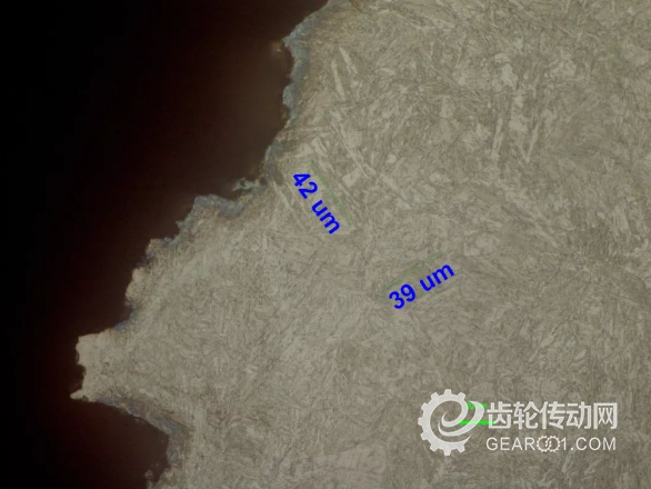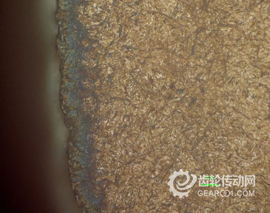 對端面裂紋附近齒部進行磨制拋光后腐蝕,如圖4所示,按照JB/T6141.3標準檢測,組織檢測結果為碳化物1級,馬氏體2級,表面局部存在較長的馬氏體針,殘留奧氏體2級,心部鐵素體1級。