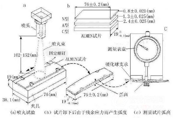 ①阿爾門(ALMEN)弧高值測(cè)定法: 目前,國(guó)內(nèi)、外應(yīng)用最廣的方法是采用美國(guó)SAE442A和SAE443標(biāo)準(zhǔn)中規(guī)定的阿爾門(ALMEN)弧高值測(cè)定法,即使用一定規(guī)格的彈簧鋼試片,通過(guò)檢測(cè)噴丸強(qiáng)化后的形狀變化來(lái)反映噴丸效果,具體測(cè)量方法見(jiàn)圖1所示。