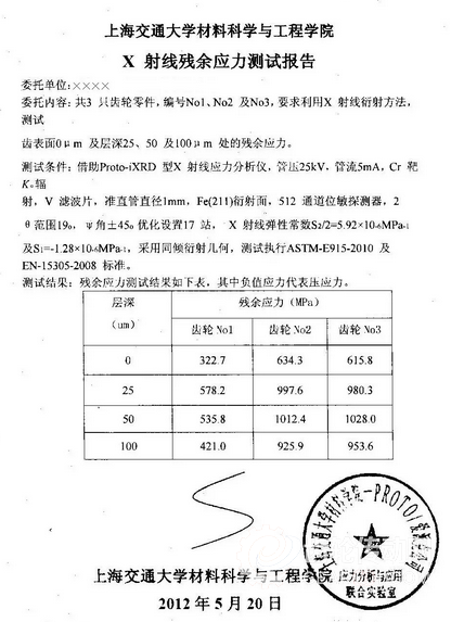 將某單位在拋丸清理機(jī)上強(qiáng)化的三個(gè)件號(hào)為(9274893)齒輪,送上海交通大學(xué)材料科學(xué)與工程學(xué)院做X射線殘余壓應(yīng)力檢測(cè)。附測(cè)試報(bào)告于后: