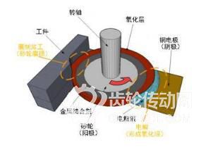其工作原理是:金屬結(jié)合劑超硬磨料砂輪的轉(zhuǎn)軸與電刷的接觸而接通電源正極作為陽(yáng)極,銅電極(工具電極)與電源負(fù)極相接作為陰極。砂輪與負(fù)極之間存在100~500μm的間隙(間距可調(diào)),利用噴嘴噴出具有電解功能的磨削液使之充滿間隙。在高電壓(60~120v)和高脈沖頻率電源的作用下,使磨削液電解產(chǎn)生陽(yáng)極溶解效應(yīng),將砂輪表層的金屬基體電解去除,與此同時(shí),在砂輪表面會(huì)產(chǎn)生一層絕緣的鈍化膜能有效抑制金屬基體的過(guò)度電解,以減少砂輪基體的過(guò)分電解損耗。因?yàn)檠趸O易磨損,從而容易使新的磨粒露出鋒利的棱角以達(dá)到修銳效果。整個(gè)加工過(guò)程中電解作用與鈍化膜的抑制作用達(dá)到動(dòng)態(tài)平衡,保證了磨粒的恒定的突出量,使砂輪在加工過(guò)程中始終保持有磨粒突出的最佳磨削狀態(tài)。該技術(shù)將砂輪的在線修整與磨削過(guò)程結(jié)合在一起,從而實(shí)現(xiàn)對(duì)工件的連續(xù)超精密鏡面磨削。