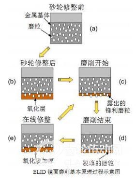 ELID(Electrolytic In-process Dressing)磨削是在磨削過(guò)程中,利用非線性電解修整作用使金屬結(jié)合劑超硬磨料砂輪表層氧化層的連續(xù)修整用與鈍化膜抑制電解的作用達(dá)到動(dòng)態(tài)平衡。從而獲得穩(wěn)定厚度的氧化層,使砂輪磨粒獲得恒定的出刃高度和良好的容屑空間,實(shí)現(xiàn)穩(wěn)定、可控、最佳的磨削過(guò)程,它適用于硬脆材料進(jìn)行超精密鏡面磨削。