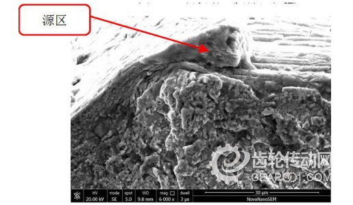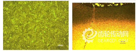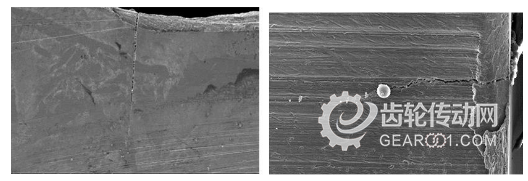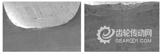 齒輪軸的滲層深度、硬度和顯微組織均未見異常,也均符合技術條件要求。齒輪軸的基體組織未見異常,心部硬度符合技術條件要求,裂紋附近未發現夾渣物等冶金缺陷。表明齒輪軸裂紋的產生與熱處理質量和基體材質關系不大。