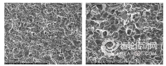 2#、3#裂紋斷口形貌相同。裂紋斷口宏觀較平整、未見明顯塑性變形,源區位于齒根端角(齒根與橫截面相交的端角)表面、小線源特征;齒根與橫截面相交的端角不夠圓滑,且加工面較粗糙,形貌如圖7、圖8所示。裂紋擴展區主要為沿晶形貌,局部為韌窩形貌,如圖9、圖10所示;人為打斷區為韌窩形貌,如圖11所示。