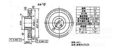 10.齒輪加工工藝過程分析1.定位基準的選擇 對于齒輪定位基準的選擇常因齒輪的結構形狀不同,而有所差異。帶軸齒輪主要采用頂尖定位,孔徑大時則采用錐堵。頂尖定位的精度高,且能做到基準統一。帶孔齒輪在加工齒面時常采用以下兩種定位、夾緊方式。(1)以內孔和端面定位 即以工件內孔和端面聯合定位,確定齒輪中心和軸向位置,并采用面向定位端面的夾緊方式。這種方式可使定位基準、設計基準、裝配基準和測量基準重合,定位精度高,適于批量生產。但對夾具的制造精度要求較高。(2)以外圓和端面定位 工件和夾具心軸的配合間隙較大,用千分表校正外圓以決定中心的位置,并以端面定位;從另一端面施以夾緊。這種方式因每個工件都要校正,故生產效率低;它對齒坯的內、外圓同軸度要求高,而對夾具精度要求不高,故適于單件、小批量生產。2.齒輪毛坯的加工齒面加工前的齒輪毛坯加工,在整個齒輪加工工藝過程中占有很重要的地位,因為齒面加工和檢測所用的基準必須在此階段加工出來;無論從提高生產率,還是從保證齒輪的加工質量,都必須重視齒輪毛坯的加工。在齒輪的技術要求中,應注意齒頂圓的尺寸精度要求,因為齒厚的檢測是以齒頂圓為測量基準的,齒頂圓精度太低,必然使所測量出的齒厚值無法正確反映齒側間隙的大小。所以,在這一加工過程中應注意下列三個問題:(1)當以齒頂圓直徑作為測量基準時,應嚴格控制齒頂圓的尺寸精度(2)保證定位端面和定位孔或外圓相互的垂直度(3)提高齒輪內孔的制造精度,減小與夾具心軸的配合間隙
