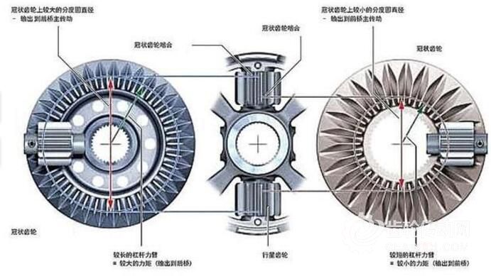 由于兩個冠狀齒輪設計的工作力臂不同,約為40:60,根據公式:力矩=力*力臂,則力矩比約為60:40(扭矩是使物體發生轉動的一種特殊的力矩),即傳遞至后軸的扭矩為60%,傳遞至前軸的扭矩為40%。當兩個冠狀齒輪出現轉速差時,四個行星齒輪就會進行自轉,帶動兩個冠狀齒輪轉動,由于冠狀齒輪的特殊幾何結構,行星齒輪會迫使冠狀齒輪產生軸向力,這個軸向力便會使冠狀齒輪產生軸向位移壓緊多片式離合器,使多片式離合器產生接合力矩,改變前后軸的扭矩分配(分配比例由冠狀齒輪的幾何特性決定).