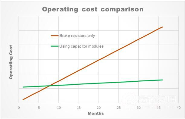 為了進行分析,我們以在中國滿負荷運行的激光切割機為例,假設每天兩班,電價為每千瓦時0.66元人民幣,空調(用于冷卻控制柜)的能效比為3。根據以上情形,將具有兩個電容器模塊的機器性能與僅具有制動電阻器的機器性能進行比較。不出意料,浪費功率的差異非常明顯。對于沒有電容器模塊的系統,一共浪費了4,500瓦,而相比之下,有電容器模塊的系統只浪費了180瓦。 這意味著每月浪費的能源超過2200千瓦時(約合人民幣1400元),而有電容器模塊的系統只需90千瓦時(約合人民幣60元)。運營成本-包括初始投資-大約在八個月左右持平,此后,使用電容器模塊的系統總體運行成本大大降低。