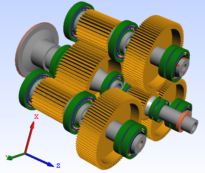 本文利用MASTA齒輪專業(yè)分析軟件進行仿真分析,仿真模型采用參數(shù)化建模,輸入該齒輪和軸的基本參數(shù),主要包括幾何參數(shù)、材料等,該功率三分支傳動系統(tǒng)中全部采用滾動軸承, MASTA中自帶軸承庫,選擇指定的軸承型號,與軸完成裝配,建立的傳動系統(tǒng)仿真模型如圖2所示。