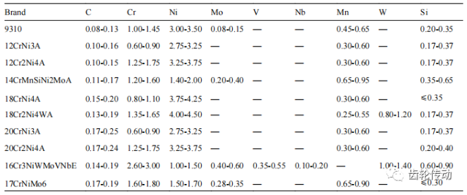 我國航空用第一代滲碳齒輪鋼材料,初期以仿制蘇聯為主,典型鋼種為 12CrNi3A、12Cr2Ni4A、14CrMnSiNi2MoA、18Cr2Ni4WA、20CrNi3A、20Cr- 2Ni4A 等,20 世紀 80 年代開始,隨著我國航空工業對外合作力度的加大,相繼引入18CrNi4A(意大利18NC16)、9310(美國)及16Cr3NiWMoVNbE(俄羅斯)、17CrNiMo6(德國)。航空第一代滲碳齒輪鋼合金化成分見表 1 ,服役溫度通常不超過 200 ℃。