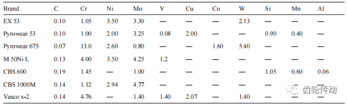 針對上述問題,冶金學家利用含 Mo 合金鋼“二次硬化”原理,設計、研制出低碳中高合金 Cr-Ni-Mo 系的第二代滲碳齒輪鋼。第二代滲碳齒輪常見牌號有 EX 53、Pyrowear 53、Py rowear 675、M 50Ni L、CBS 600、CBS 1000M、Vasco x-2 等,常見牌號合金化成分如表 2 所示,第二代滲碳齒輪鋼的服役溫度上限提升至 350 ℃。