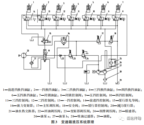 此變速箱液壓系統有 2 個油泵 26 和 27,吸油前均先經過吸油過濾器 28,油泵 27 提供的液壓油經過精濾器 25 后給換擋系統和變矩器供油,安全閥 18 保證液壓油壓力小于 2. 8 MPa。當換擋回路中擋位控制閥 (8 ~ 19) 打開時,液壓油通至換擋油缸 (1 ~ 6) 實現換擋。需要閉鎖時,液力變矩器閉鎖控制閥 8 打開,液壓油通至前進擋換擋油缸 1 實現變矩器閉鎖。油泵 26 直接將液壓油提供至變速箱的潤滑系統,潤滑調壓閥 24 保證潤滑壓力小于 0. 3 MPa,多余的液壓油通至液力變矩器。