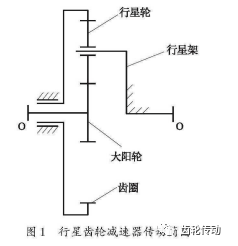 本文的研究對(duì)象是一種行星架固定的行星齒輪減速器,用于某家用電器高速電機(jī)的傳動(dòng),作用是減速增扭。其主要結(jié)構(gòu)包括兩個(gè)傳動(dòng)軸、一個(gè)行星架和一個(gè)行星輪系。輸入軸與太陽輪固連,輸出軸與齒圈固連,行星輪在行星架上,行星架固定。其傳動(dòng)結(jié)構(gòu)簡(jiǎn)圖如下圖1所示。