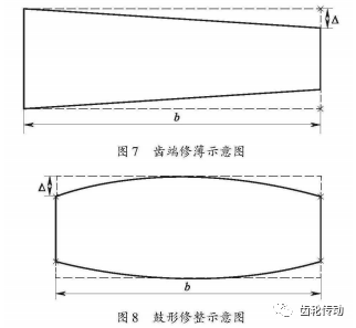 齒向修形一般常用鼓形修整和齒端修薄等方法。如下圖所示齒端修薄是在齒面上沿齒厚方向?qū)X厚向一端或兩端逐漸剪薄。鼓形修整是使整個(gè)齒面中間鼓起,兩端對(duì)稱。