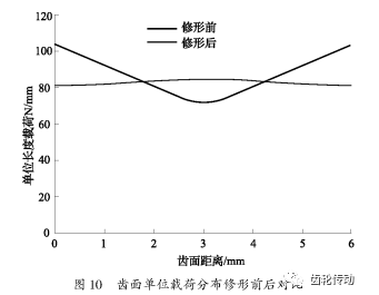 修形后再次計(jì)算太陽輪與行星輪齒面接觸應(yīng)力的分布,單位長(zhǎng)度的最大載荷由原來104N/mm 降低為 85N/mm。修形前后的載荷分布對(duì)比如下如10所示: