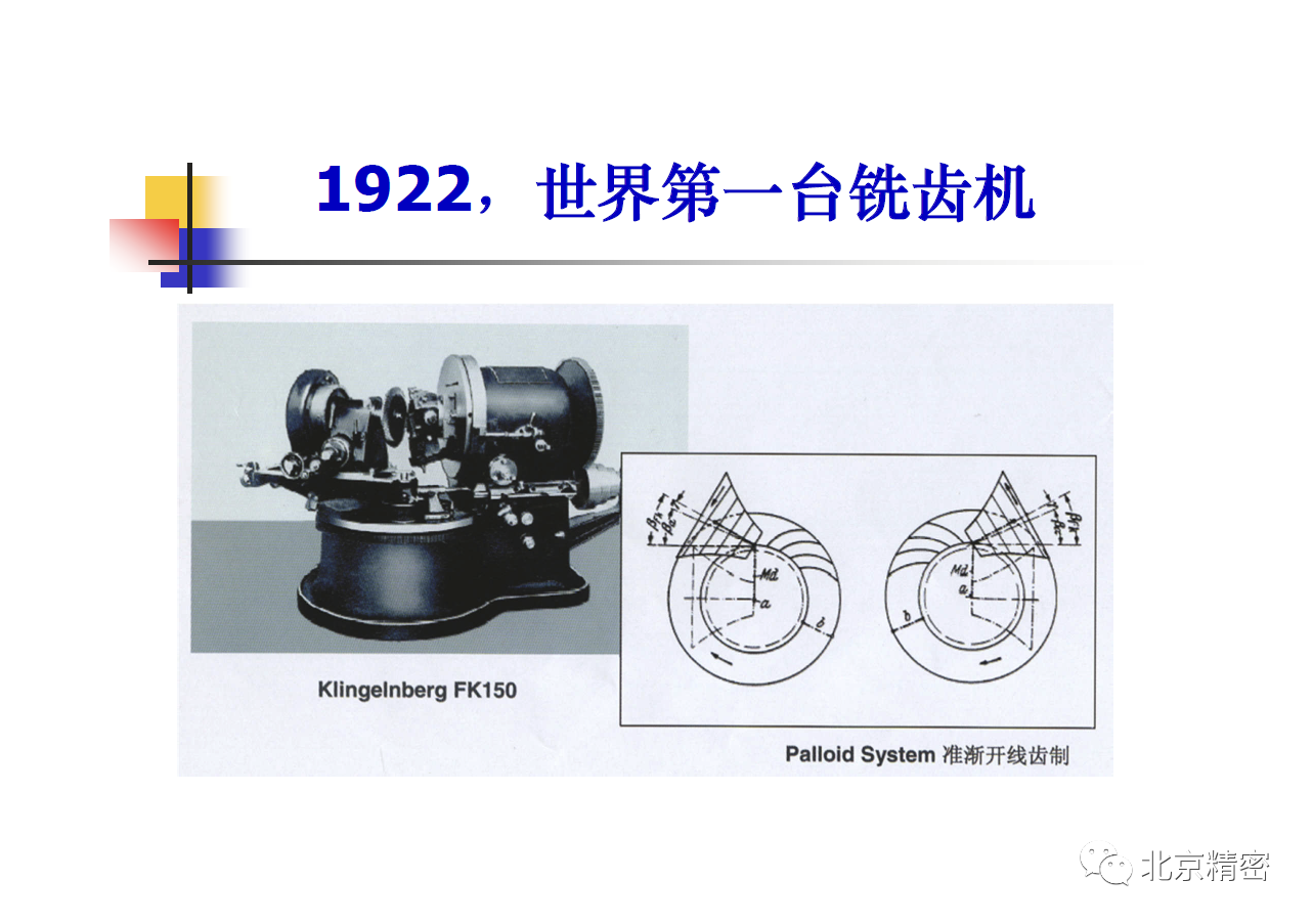 世界上第一臺螺旋錐齒輪銑齒機是1922年誕生的,至今剛好一百周年。一百年來,由于美國格里森公司和德國克林貝格公司的工作,不僅創立了用于研究點接觸共軛齒面的現代嚙合理論,而且形成了一套用于齒輪修形,分析,加工,測量,反調的標準技術,極大地豐富了齒輪理論和技術。