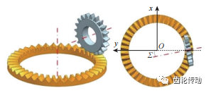 車齒加工坐標系:車齒可以看作是滾齒和插齒的結合。在加工過程中,刀具和工件同時圍繞中心軸高速旋轉。同時,刀具沿工件徑向(圖 1 中 y 方向)移動,逐層切除工件,當刀具從工件的外圓平移到內圓時,即可完成整個面齒輪的加工。
