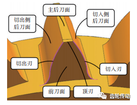 車齒刀后刀面分為主后刀面、切入側后刀面和切出側后刀面(由于實際加工過程中車齒刀兩側刃不是同時切入和切出工件,定義先切入工件的一側刀刃為切入刃,另一側為切出刃),為保證車齒加工過程中刀具后刀面不與工件發生接觸,將主后刀面設計成圓錐面,將側后刀面設計成不同螺旋角的螺旋面。圖 4 為車齒刀結構示意圖。