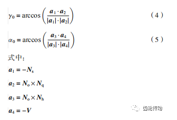 由圖 3 所示前刀面形成過程,前刀面法矢可求得為Nq = (−sin β,tan γ, cos β) ,而后刀面為理論螺旋面,其上任一點法矢Nh 也可求得。因切削平面 Ps由切削速度V 和切矢q構成,切削平面法矢Ns 可表示為:Ns = V × q , 而切矢q 同時垂直與Nq和Nh,有 q = Nq × Nh。主截面法矢No 同時垂直于Ns 和V,有No = Ns ×V。