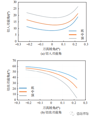 2) 根據切削原理,建立了切削角度的數學模型,分析了刀具切削角度在加工過程中的變化規律,分析了車齒刀具設計參數(前角和后角)對切削角度的影響。